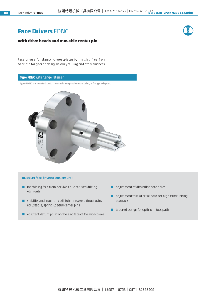 滚齿用端面驱动 – FDNC 中心顶尖的跳动是0.02mm以内 使用于滚齿机或花键铣床 加工靠近夹具端时有较大的刀具避让空间 可以同时满足高精度加工要求和生产率提高需求 代替卡盘在主轴端夹紧工件并驱动 尾座推力大小关系到驱动齿的驱动扭矩的传递效率 通过非标定制可以实现非常规尺寸的工件驱动